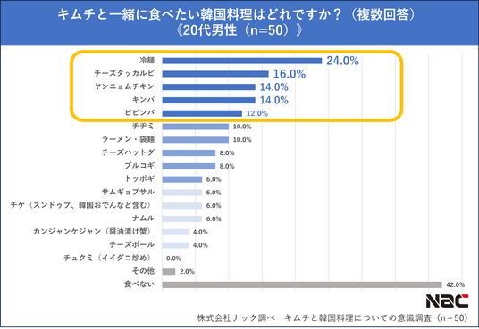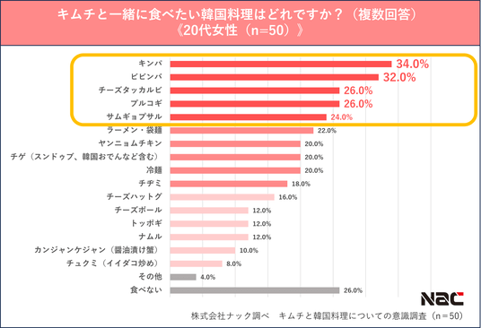 続いて、キムチと一緒に食べたい韓国料理をすべて選んでもらったところ、こちらも「ビビンバ」が35.6%を占めて全体1位となりました。世代別に見ると、30代以上は男女ともに全体の傾向と似ていたのに対し、20代女性は「キンパ」が34.0%で1位、20代男性は「冷麺」が24.0%で1位となり、前項と同様20代のみほかの世代と異なる傾向が見られました。