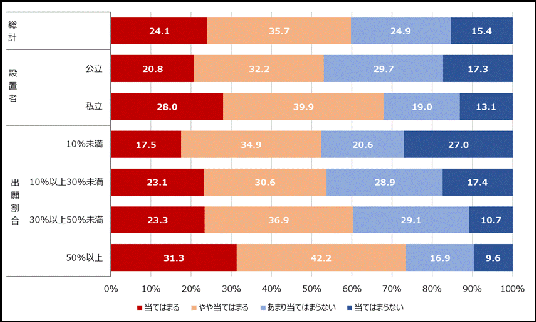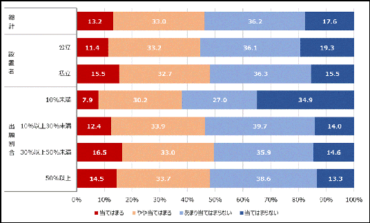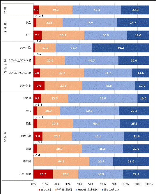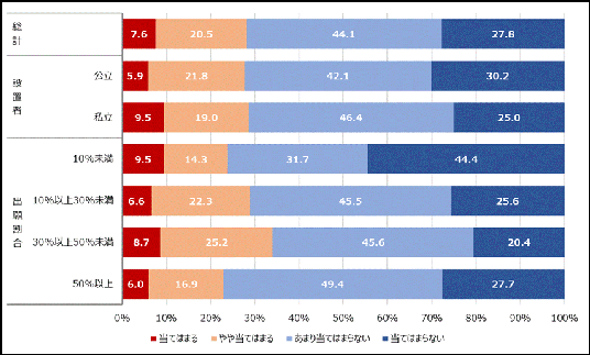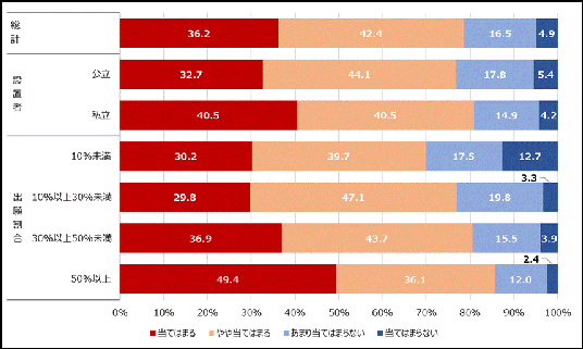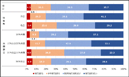 - 設置者別では公立高校において否定的な傾向が顕著に表れた。私立では「当てはまる」「やや当てはまる」の割合が4割を超え、肯定的にとらえている層が一定数いることがわかった。