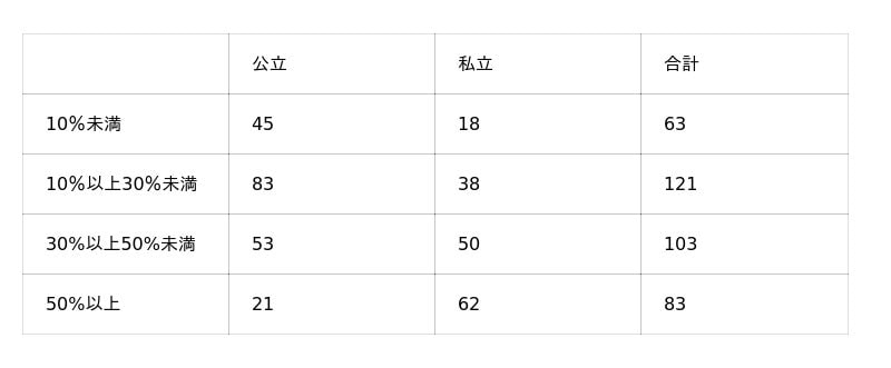 - 設置者別では大きな違いはなかったが、出願割合別でみると、30%以上50%未満では面接・小論文等のウエイトを高めるべきと考える割合が他と比較してやや高かった。10%未満では「当てはまらない」の割合が44.4%であった。その理由として面接をはじめとする学力検査以外の方法では何が評価されているのかが明確でないことなどが自由記述に挙げられていた。