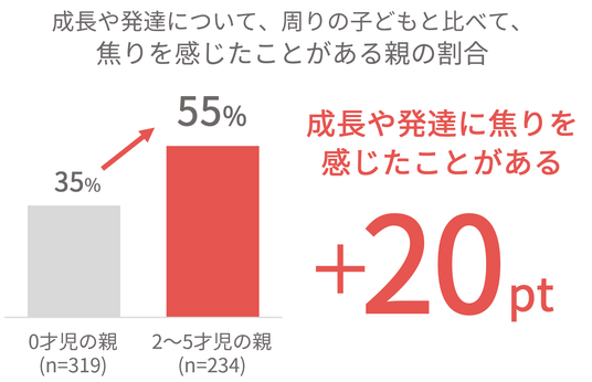 「成長や発達(※2)について、周りの子どもと比べて、焦りを感じたことがある」と回答したキッズ世帯のママ・パパは55%で、0才児の親と比べて20ポイント高い結果となり、子どもの年齢が上がり自分でできることが増える時期だからこそ、直面する悩みがあることが示唆されました。