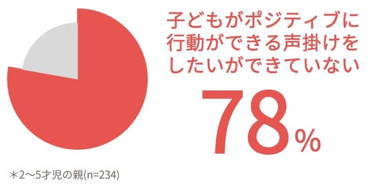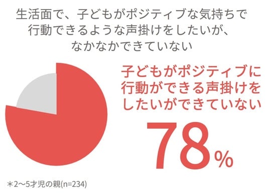 子どもの自立を促したいものの、「子どもがポジティブな気持ちで行動できるような声掛けをしたいが、なかなかできていない」と答えたママ・パパは78%に上り、サポートができていない現状が明らかに。