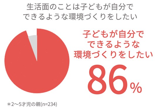 「生活面のことは子どもが自分でできるような環境づくりをしたい」と回答した割合は86%と高い結果に。子どもが自分でやってみようと思う瞬間を増やすための声掛けや、自分の力でできるようになるための環境づくりを整えたいと考えるママ・パパが多いことがわかった。
