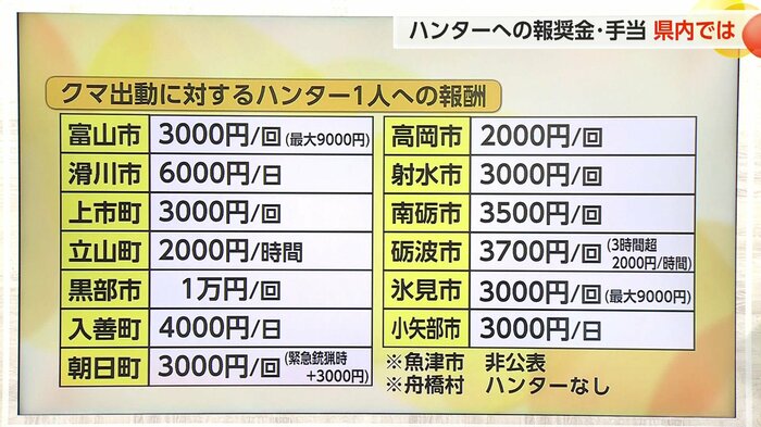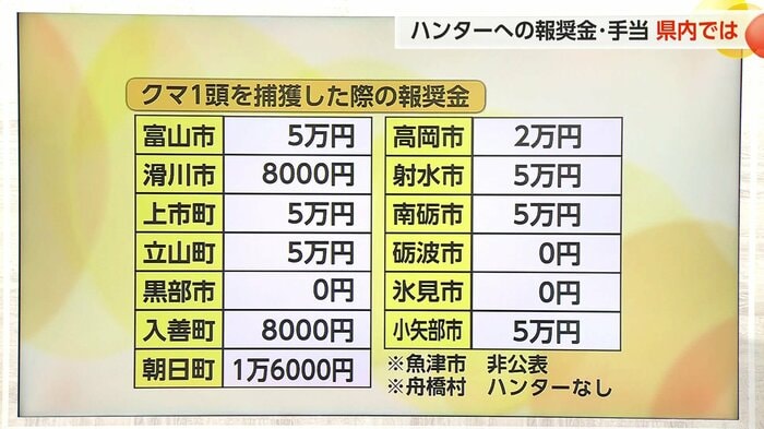 まずはクマを捕獲した際の「報奨金」では、猟友会がない舟橋村と回答を非公開とした魚津市を除く13の自治体のうち、これまで9つの市や町で設けられていて、今回立山町でも新設されました。金額はバラツキがあり、富山市、上市町、立山町、射水市、南砺市、小矢部市では5万円支給されています。