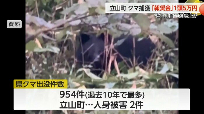 クマの大量出没を受け、富山県立山町はクマを捕獲したハンターに払う「報奨金」を初めて設けました。ハンターが出動した際に払う報酬も引き上げます。