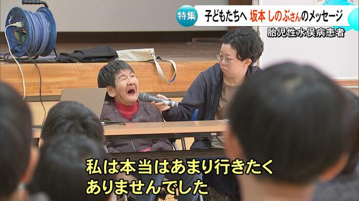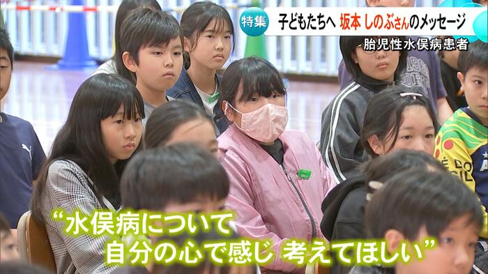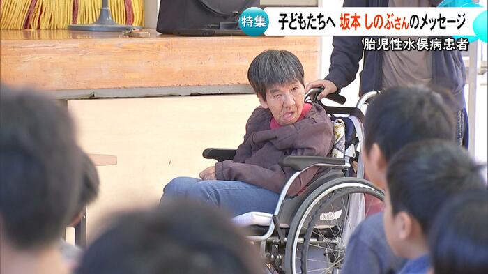 胎児性水俣病患者の坂本しのぶさんが、11月7日に熊本・菊陽町の小学校を訪れ、講演を行った。まっすぐなまなざしで見つめる子どもたちを前に、思いを伝えたしのぶさん。そのメッセージとは。