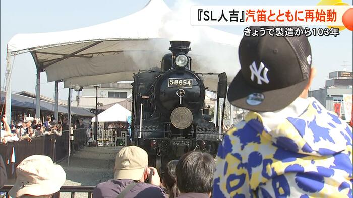 「再始動、出発進行!」の掛け声に合わせて、現役のころのように力強く汽笛を鳴らしたSL人吉は多くの人たちが見守る中、ゆっくりと車輪を回し、約1年8カ月ぶりに自分の力で前に進んだ。