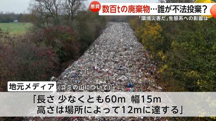 ゴミの山について、地元メディアは「長さ少なくとも60m、幅15m、高さは場所によって12mに達する」と伝えている。
