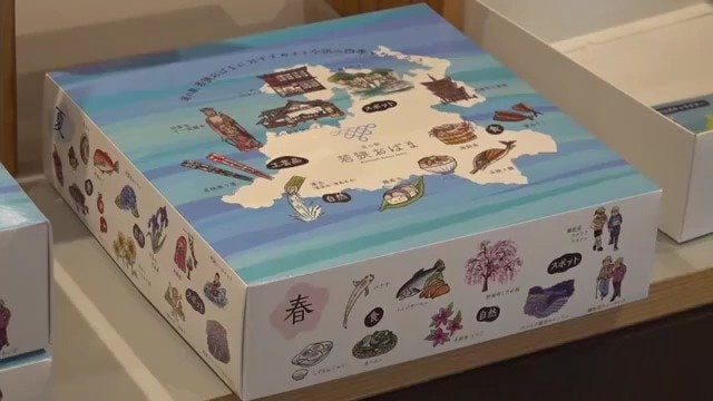 詰め合わせ用のボックスは、小浜の観光名所をはじめ、地域の食文化や伝統工芸などがデザインれている。青と白を基調としたパッケージには、若狭おばまを中心とした地図と特産品のイラストが描かれており、一目で地域の魅力が伝わるよう工夫されている。