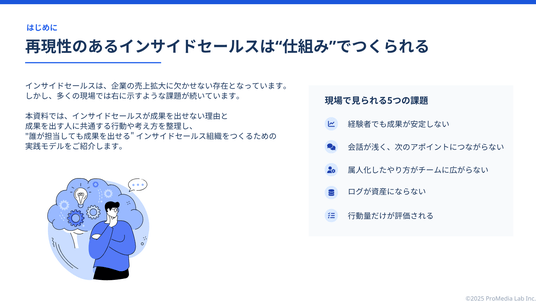 株式会社プロメディアラボ(本社:東京都中央区、代表取締役:廣瀬義憲)は、インサイドセールスが成果を出せない理由と、成果を出す人に共通する行動・考え方を整理した資料『インサイドセールス成果創出ガイド ― インサイドセールスが成果を出せない理由と、成果を生む人の共通点 ―』を公開しました。