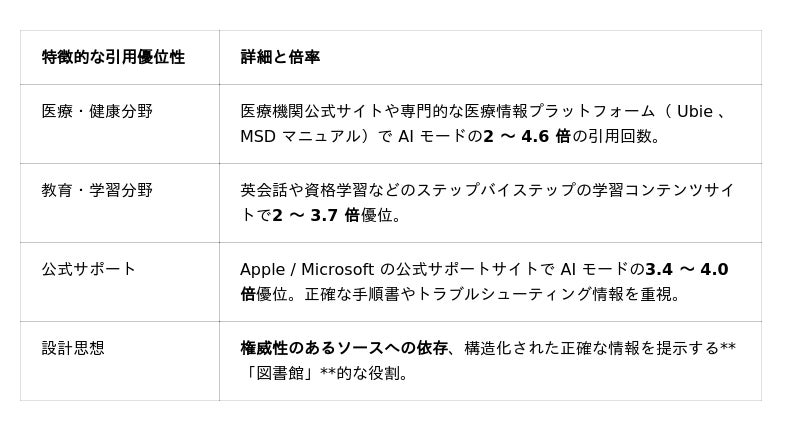 AI Overviews は、「定義型コンテンツの優位性」と「リスク回避の姿勢」が際立ちます。情報の正確性、権威性、信頼性( E-E-A-T )を最優先し、医療や教育など、ユーザーの人生に影響を与える YMYL 分野で圧倒的な強みを見せました。
