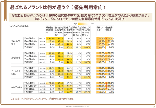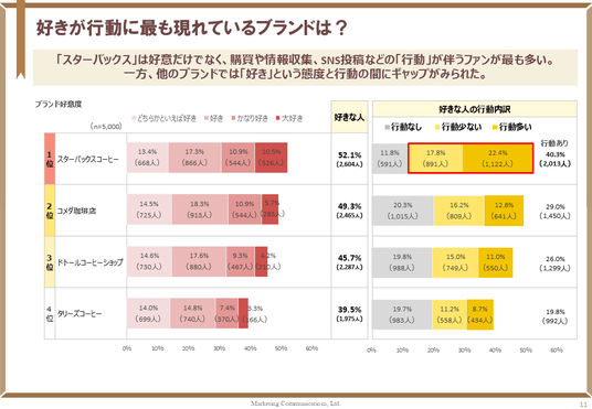 分析の結果、「好き」という感情だけでは購買などの行動には直結しない一方、スターバックスは好意だけでなく、購買などの具体的な行動が伴うファンが最も多いカフェブランドであることがわかりました。スターバックスは購買はもちろん、新商品や季節メニューのチェック、キャンペーン情報の閲覧、会員サービスの利用など、さまざまな行動が他ブランドより活発です。