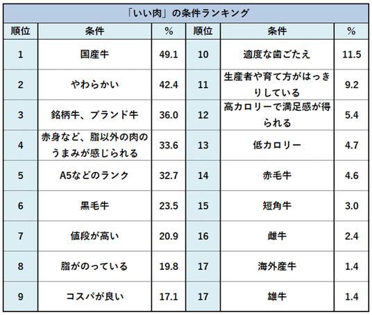 「いい肉の日」に食べたい肉を聞いたところ約7割が「牛肉」を選び、「いい肉=牛肉」という意識が強く根付いていることがわかりました。また、“いい肉”の条件(次ページ)として、「値段の高さ」や「脂ののり」より、「国産牛」「やわらかい」「銘柄牛、ブランド牛」が上位を占め、品質への期待や口当たりの良い上質な食感、プレミアム感が重視されているようです。また「赤身など、脂以外の肉のうまみが感じられる」も上位にランクインしており、健康志向への高まりから、赤身や適度な脂の肉を選ぶ人が増えていることも影響しているのではないでしょうか。牛肉には「ごちそう」「特別な日に食べるもの」というイメージもありますが、特別な体験を求めるだけでなく、多様な楽しみ方が広がりつつあるようです。11月29日の「いい肉の日」は、そんな“特別なひと口”を味わってみてはいかがでしょうか。