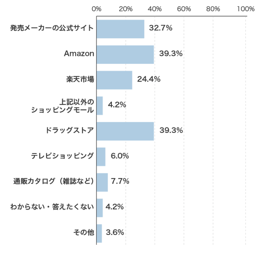 Amazon、ドラッグストアでの購入が同じ比率でトップに並びました。そのあとには、メーカーの公式サイトが続いています。