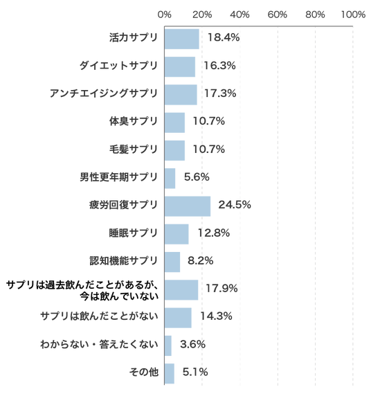 ダイエット、アンチエイジング、体臭、毛髪、睡眠などに関連したサプリも10~20%程度の人が服用しているようです。