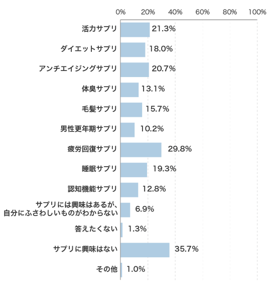 アンチエイジング、ダイエットなど、見た目を意識したサプリもかなりの割合の人が興味を示しています。
