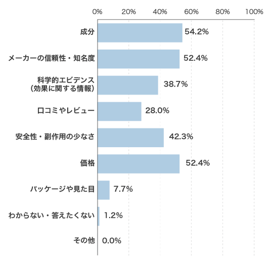 サプリを選ぶ際の重視するポイントを複数回答で聞いたところ、成分、メーカーへの信頼、価格がそれぞれ半分をこえました。口コミやレビューが意外に少ないのは、それ自体への信頼度の低さかもしれません。