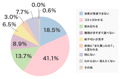 サプリメントの服用を継続するための、最大のハードル(障害)を聞いたところ、コストがかかるという回答が4割を占めました。