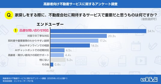 エンドユーザーに「家探しをする際、不動産会社に期待するサービスで重要だと思うものは何ですか?」と質問したところ、最も多かった回答は「迅速な問い合わせ対応」で34.1%、次いで「対面での丁寧な対応」(20.3%)、「契約書や重要書類のわかりやすい説明」(17.2%)という結果となりました。