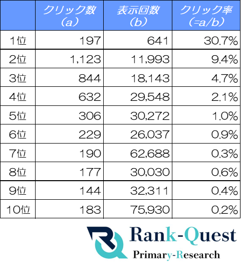 対象キーワードは、2025年10月中にランクエストサイトで検索結果1位から10位に掲載されたものに限定し、各順位ごとのクリック率を分析しました。