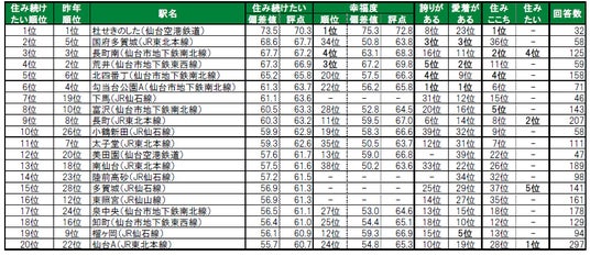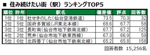 1位は2年連続で名取市に位置する杜せきのしたで、唯一偏差値70台の高い評価を得ています。杜せきのしたは、「住みここち(駅)」でも1位となっている駅です。2位も2年連続で塩竈市に位置する西塩釜です。3位は、仙台市若林区に位置する荒井で、昨年24位から大きく順位を上げてトップ3入りしています。
