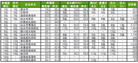 ※街の幸福度・街に誇りがある・街に愛着があるの順位が「-」と表示されているのは、偏差値50未満のため「-」と表示しています。