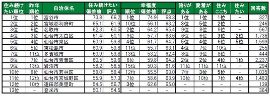 ●1位の富谷市は、「住みここち(自治体)」を含む5つのランキングで1位の高い評価を得ています。●トップ10のうち、7自治体が「住みここち(自治体)」でもトップ10以内に入っている自治体です。●昨年は偏差値50未満で順位を公開しておらず今年トップ17入りしたのは、16位亘理郡亘理町、17位宮城郡松島町です。