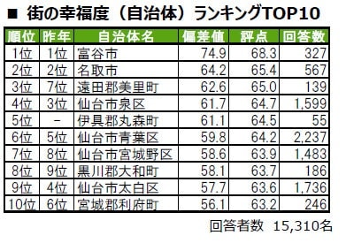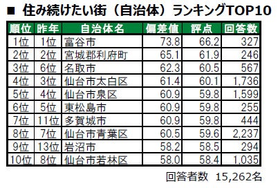 1位は5年連続で富谷市で、唯一偏差値70台の高い評価を得ています。2位は4年連続で宮城郡利府町で、トップ10内では唯一郡部に属する「町」です。トップ2は、「住みここち(自治体)」でもトップ2となっている自治体です。3位は名取市で、昨年6位から順位を上げてトップ3入りしています。