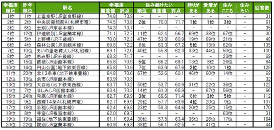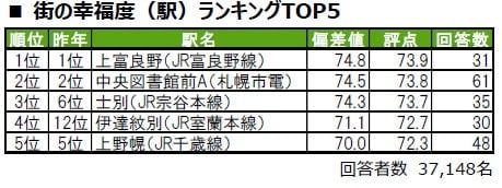■街の幸福度(駅)トップは、3年連続で上富良野