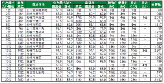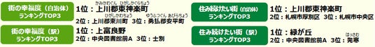1位は、昨年3位から順位を上げた上川郡東神楽町です。2位は札幌市厚別区、3位は札幌市中央区です。トップ10のうち、6自治体が札幌市の行政区となっています。