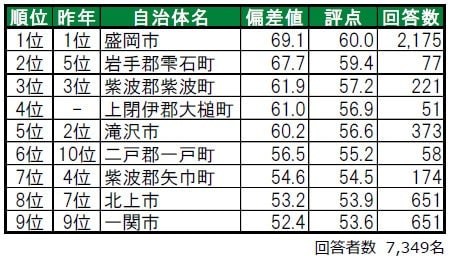 街の幸福度の1位は4年連続で盛岡市。2位は昨年8位から順位を上げた岩手郡雫石町。3位釜石市。