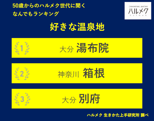 販売部数No.1(※1)雑誌「ハルメク」などのマーケティングやリサーチのコンサルティングを通じて、50代以上のインサイトを日々探求する「ハルメク 生きかた上手研究所」は、50歳以上の女性(事前調査506名、本調査546名)へのアンケート結果をもとにした「50歳からのハルメク世代に聞く なんでもランキング」を公開しました。テーマは「好きな温泉地」です。