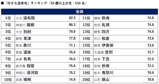 50代以上女性の96.4%が「好きな温泉地がある」と回答。旅慣れした平均年齢64.9歳の彼女たちが選んだのは、街としての総合力が高い“王道の名湯”で、1位は湯布院、2位は箱根、3位は別府という結果でした。