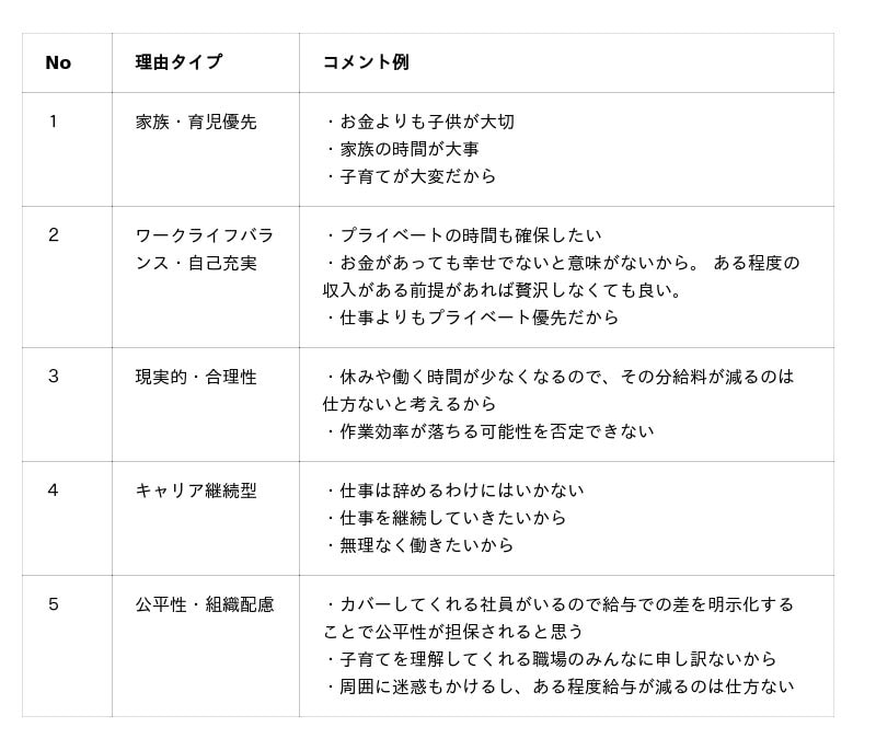 従業員の自由回答からは、「減収してでも柔軟な働き方を望む」という切実な声も見られました。その背景には「家族や生活を優先したい」「子育てが大変だから」「無理なく働き続けたい」など多様な理由が存在し、減収を受け入れる判断は一様ではなく、家庭環境や職場の状況、個人の価値観など、さまざまな要因が交錯しています。
