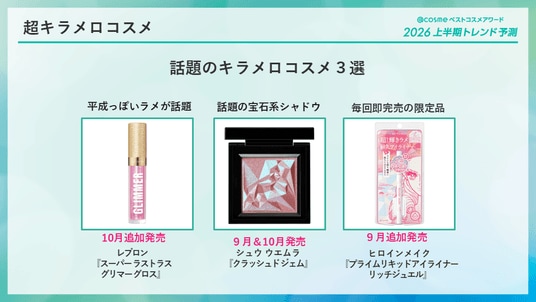 @cosmeでのリップグロスの商品登録数は2025年10月末時点で昨対約1.3倍に増加。クチコミ件数も2025年10月末時点で昨対比約1.3倍と増加傾向にあり、注目度の高さが見て取れます。また、SNSで「宝石系アイシャドウ」と話題のアイテムなど、リップ以外の“キラキラ”コスメにも注目が集まりつつあります。