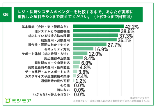 Q4で「2~3社」「4~5社」「6社以上」と回答した方に、「Q6.レジ・決済システムのベンダーを比較する中で、あなたが実際に重視した項目を3つまで教えてください。(上位3つまで回答可)」(n=83)と質問したところ、「基本機能(会計・売上管理など)」が42.2%、「他システムとの連携機能」が38.6%、「対応している決済方法の種類」が37.3%という回答となりました。