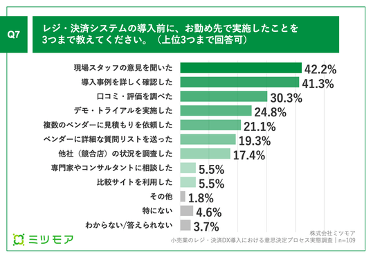 「Q7.レジ・決済システムの導入前に、お勤め先で実施したことを3つまで教えてください。(上位3つまで回答可)」(n=109)と質問したところ、「現場スタッフの意見を聞いた」が42.2%、「導入事例を詳しく確認した」が41.3%という回答となりました。