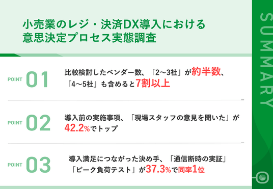 【小売業のレジ・決済システム導入調査】ベンダー比較は2~3社が約半数、4~5社も含め7割超。導入の決め手は「現場の声」が最多、満足の要因は「通信断時の実証」、一方で後悔の理由は「決済方法の確認不足」