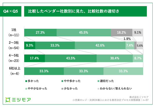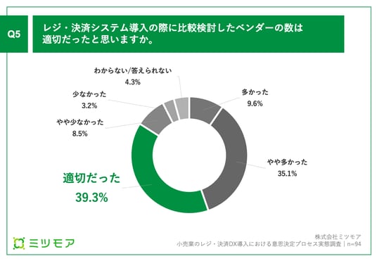 Q4で「わからない/答えられない」以外を回答した方に、「Q5.レジ・決済システム導入の際に比較検討したベンダーの数は適切だったと思いますか。」(n=94)と質問したところ、「適切だった」が39.3%という回答となりました。