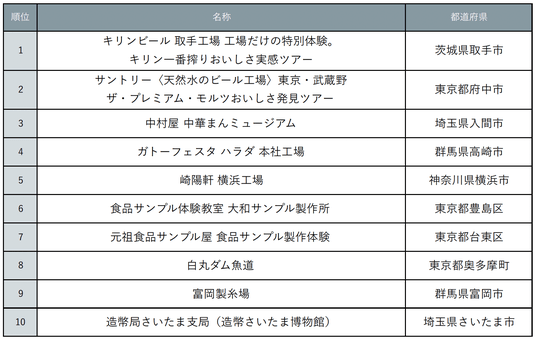 『じゃらん』大人が楽しめる関東の工場見学・社会科見学ランキング