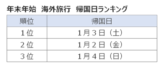 出発日としては12月出発が人気で、全体の50.7%が12月26日(金)~28日(日)の3日間に出発する結果となりました。年末年始における出国ピークは「12月27日(土)」、帰国ピークは「1月3日(土)」です。