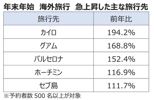 予約者数の前年からの伸びが高い主な旅行先としては、今年11月1日に大エジプト博物館がグランドオープンしたことが大きな話題となっているエジプトの空の玄関口「カイロ」が前年比194.2%と高い伸びをみせました。コロナ前の2019年比でも219.9%と好調です。海外旅行予約者数ランキングで5位にランクインもしている「グアム」は、HISが12月29日~31日出発でチャーター便を3本運航することもあり、前年比168.8%となりました。なお、チャーター便は全て完売しております。