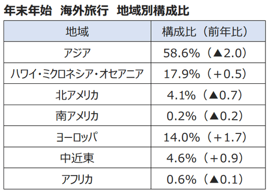 アジア地域の旅行先が根強い人気、ヨーロッパ地域・中近東地域も増加