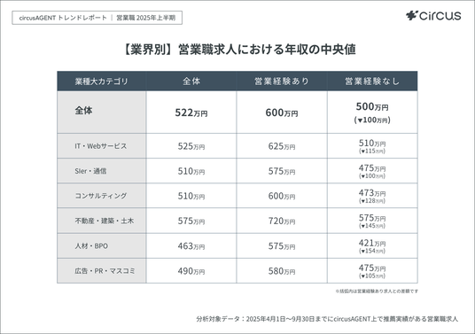 営業職全体の想定年収中央値は522万円であり、経験者向けは600万円、未経験者向けは500万円となりました。