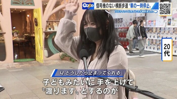 歩行者が気づいてもらうためにできることを聞くと、「子どもみたいに手を上げて“渡ります”とするのが一番かもしれないけど、大人になると恥ずかしい」と照れ笑い。