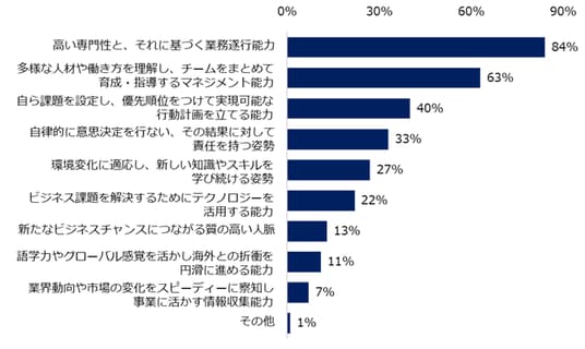 続いて、35歳以上のミドル人材に採用企業が求めるスキルを伺うと、トップは「高い専門性とそれに基づく業務遂行能力」(84%)でした。ミドル人材に求められるスキルの変化について具体的なコメントも紹介します。