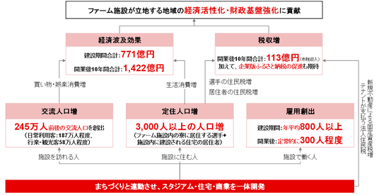 ファイターズは、既存のファーム施設とは異なり、スタジアム、グラウンド、選手寮などの球団関連施設にとどまらず、住宅や商業施設などを含む包括的な構想に基づく開発を志向しています。このようなまちづくりと連動させた開発を行うことで、開業後10年間で、約1,420億円の経済波及効果、約110億円の税収増を創出することが見込まれ、地域経済の活性化・財政基盤強化に貢献することが期待されます。