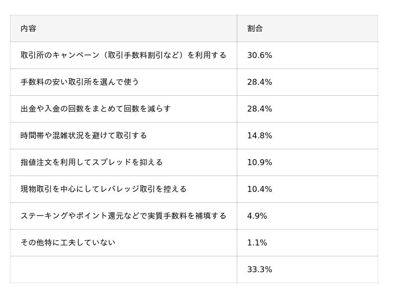 ・手数料を抑えるための工夫として「キャンペーンを利用する」(30.6%)が最も多く、「手数料の安い取引所を選んで使う」(28.4%)、「出金や入金をまとめて回数を減らす」(28.4%)が続いた。また、手数料が安いと感じた取引所は「Coincheck」(20.2%)が最多だった。