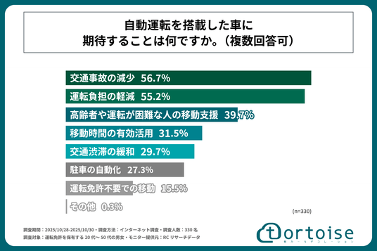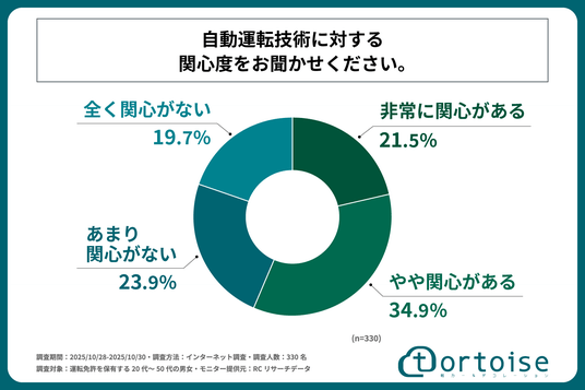 株式会社トータス(本社:神奈川県大和市、代表取締役社長:村野 公紀)が運営する「tortoise」は、運転免許を保有する20代~50代の男女を対象に「自動運転搭載車の利用意向に関する調査」を実施しました。この調査から、運転免許を保有する20代~50代の男女の自動運転技術への関心度や将来的な利用意向、不安に感じることなどが明らかになりました。