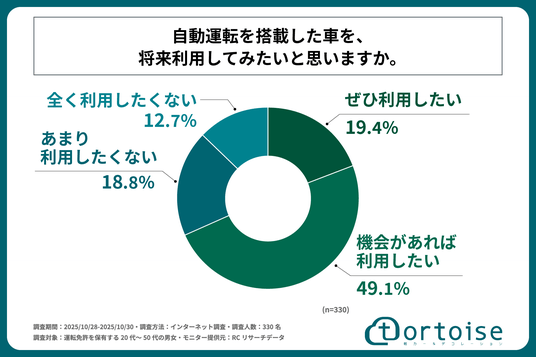 未来のモビリティとして期待される自動運転搭載車。技術の進化が著しい一方で、実際に利用する際の意識には期待と共に戸惑いや不安も見られ、これが自動運転の社会実装における重要な論点となっています。そこで、「tortoise」は、運転免許を保有する20代~50代の男女を対象に「自動運転搭載車の利用意向に関する調査」を実施しました。