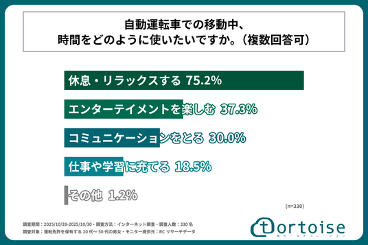 次に、「自動運転車での移動中、時間をどのように使いたいか」を尋ねる設問への回答では、1位が「休息・リラックスする」で75.2%、2位が「エンターテイメントを楽しむ」で37.3%、3位が「コミュニケーションをとる」で30.0%という結果になりました。この結果から、運転免許を保有する20代~50代の男女の75%以上が、自動運転車での移動中の時間を、「休息・リラックスすること」に使いたいと考えていることがわかりました。